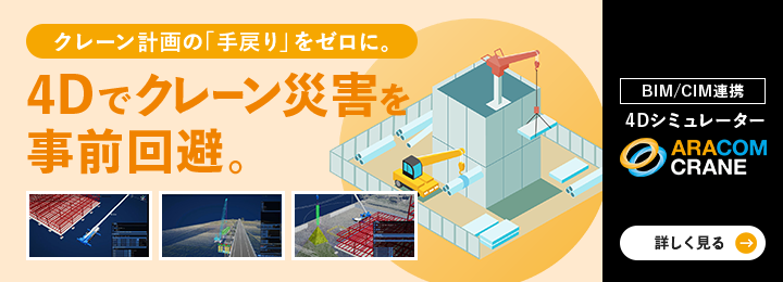 BIM/CIMデータを作成するだけでなく、設計・施工計画に具体的に活用する取り組みとして、アラヤのクレーンシミュレーター事例があります。